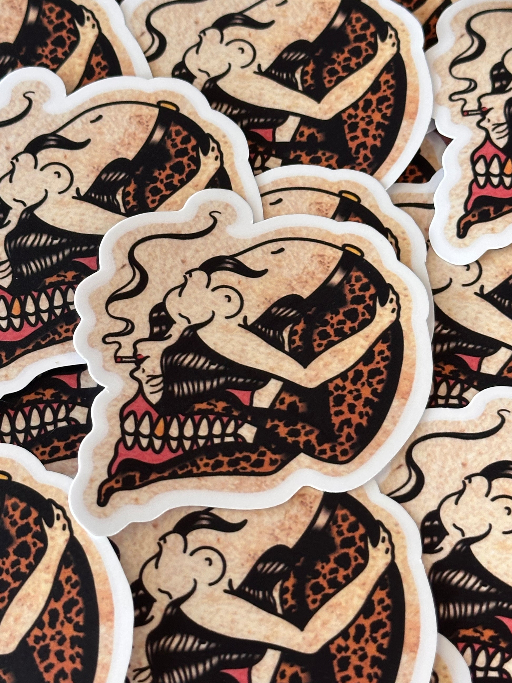 This is probably one of my favorite traditional pieces, an optical illusion where a character is bent back in the shape of a skull. This design is part of my cheetah print line! Cheetah aesthetic paired and appreciated with the natural form of the naked body. MATTE finish